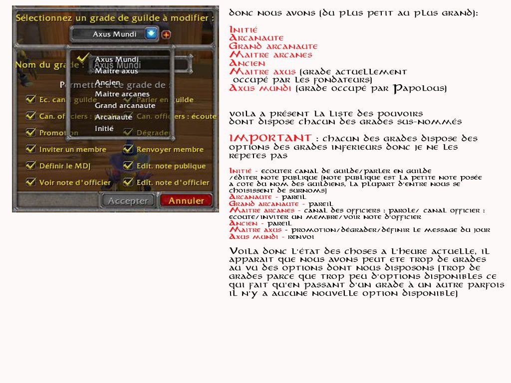 Suite a la demande dans ce forum je met en ligne les grades qui sont actifs en ce moment même au sein de notre guilde ainsi que leurs options respectives.